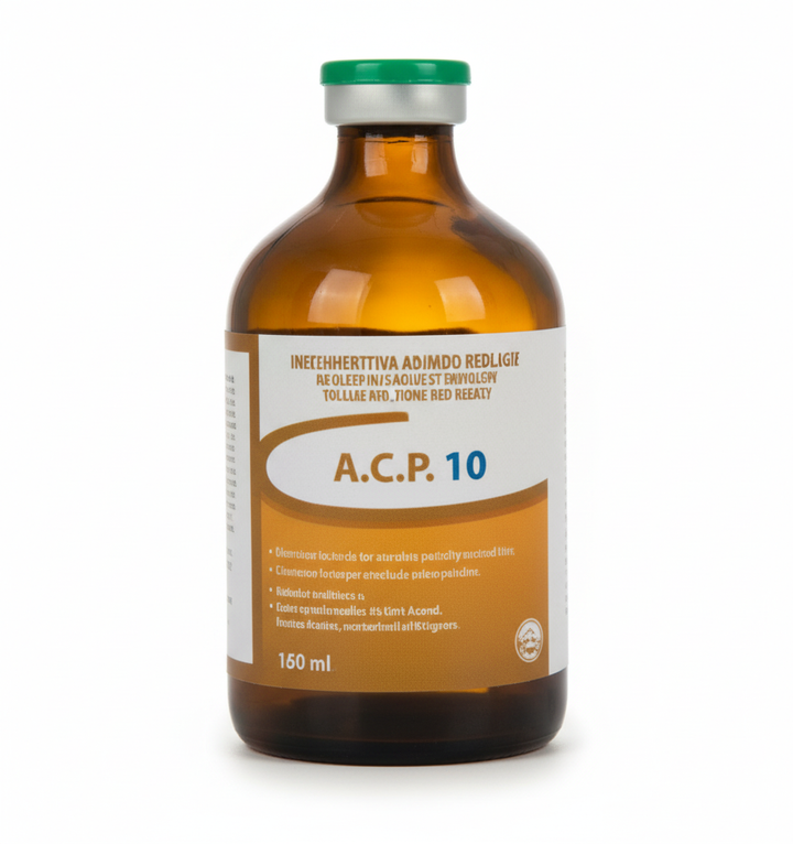 A.C.P. 10 Injection contains Acepromazine maleate, a potent phenothiazine-derived tranquilizer widely used in horses and dogs.