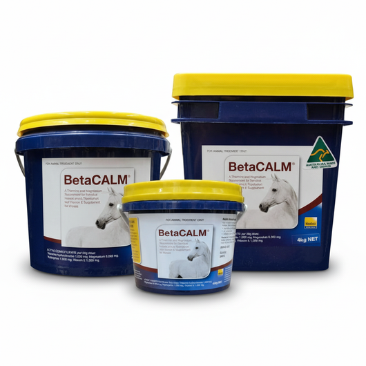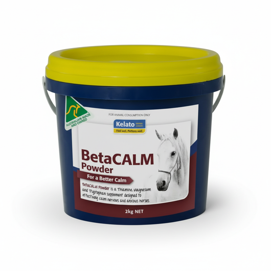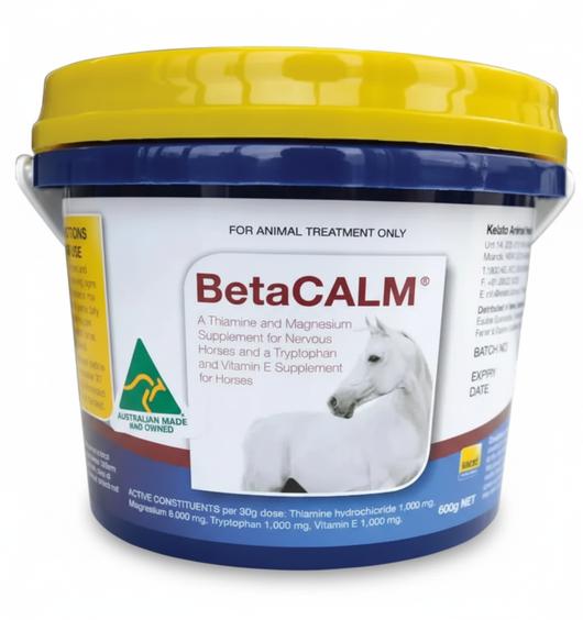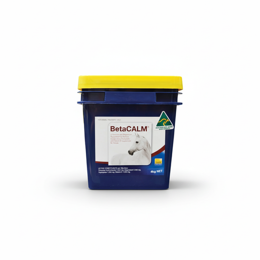 BetaCALM Powder is a daily feed supplement formulated to help manage anxiety, excitability, and stress-related behavior in horses. It combines L-tryptophan, magnesium, B-vitamins, and selected herbs, supporting calm behavior and improved focus without sedation. Ideal for long-term use in performance and pleasure horses.