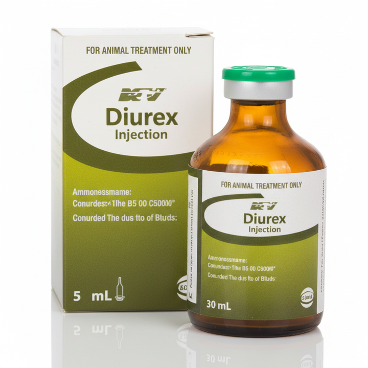 Diurex Injection is a fast-acting diuretic formulation designed to promote urine excretion, reduce edema, and eliminate excess body fluids caused by heart, kidney, or training-related stress.