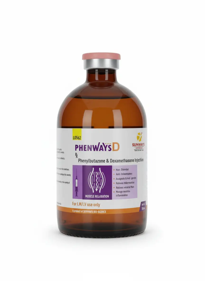 PHENWAYS D is a combination injectable therapy containing Phenylbutazone and Dexamethasone, formulated to deliver rapid anti-inflammatory, analgesic, and antipyretic effects in large animals.