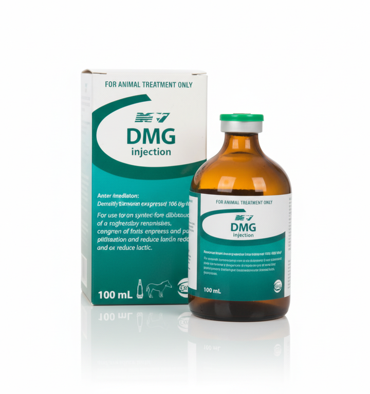 حقن دي إم جي عبارة عن حقنة تحتوي على ثنائي ميثيل جليسين (DMG)، وهو مركب عضوي طبيعي له العديد من الفوائد الصحية للخيول والإبل.